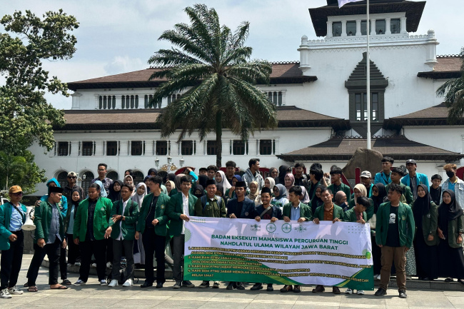 Bandung — Badan Eksekutif Mahasiswa Perguruan Tinggi Nahdlatul Ulama (BEM PTNU) Se-Nusantara Wilayah Jawa Barat mengadakan Seminar Nasional yang bertema dan deklarasi Pemilu Damai di depan gedung sate Bandung yang di selenggarakan di gedung PWNU Jawa Barat pada, Sabtu (27/1/2024).