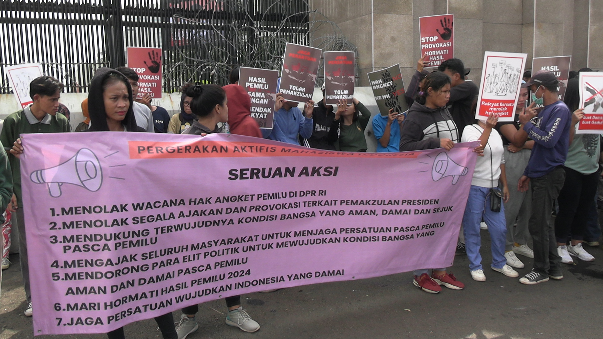 Mereka kembali datang untuk menyatakan sikap tegas kepada anggota DPR RI agar menolak hak angket Pemilu 2024.