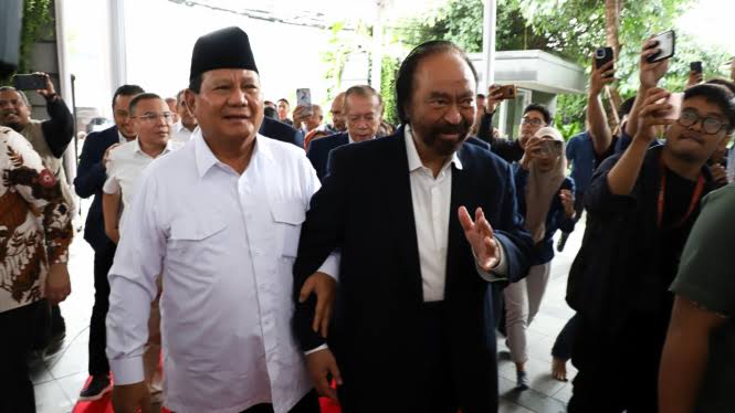 Prabowo dan Paloh kemudian masuk ke dalam gedung. Mereka berjalan di atas karpet merah di NasDem Tower.