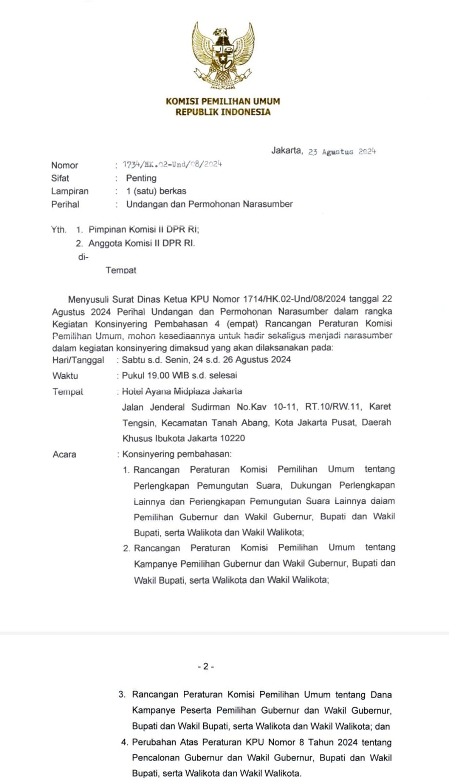 Jakarta – Komisi Pemilihan Umum Republik Indonesia (KPU RI) berencana menyelenggarakan Kegiatan Rapat Konsinyering Pembahasan empat Rancangan Peraturan KPU di Hotel Ayana Midplaza Tanah Abang, Jakarta Pusat.