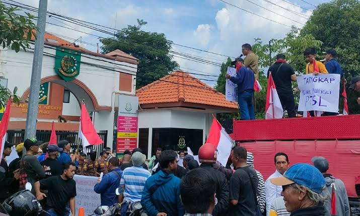 Sidoarjo – Puluhan warga Desa Banjarkemantren, Kecamatan Buduran melakukan aksi demo di depan kantor Kejaksaan Negeri (Kejari) Sidoarjo, Rabu (5/2).