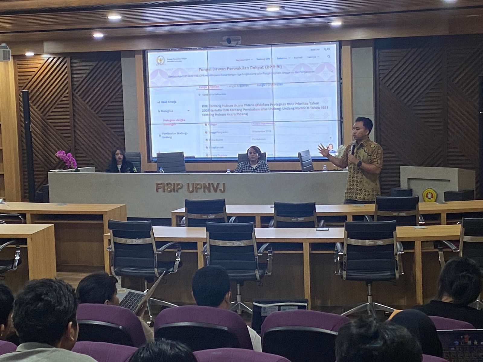Jakarta — Badan Eksekutif Mahasiswa Universitas Pembangunan Nasional “Veteran” Jakarta (BEM UPNVJ) menggelar diskusi publik bertajuk “Pro dan Kontra RKUHAP: Membaca Skema ‘Baru’ Hukum Acara Pidana Indonesia” di Auditorium Diplomasi FISIP UPNVJ, Jumat (19/9). Diskusi ini menghadirkan akademisi dan aktivis hukum Fariz Widiyatmoko (akademisi Ilmu Politik UPNVJ), Oka Kertiyasa (Project Officer Indonesian Parliamentary Center), dan Rifa Fadhilatun Nisa (Kepala Departemen Kajian Strategis BEM FH UPNVJ) sebagai narasumber untuk menelaah urgensi serta isu-isu krusial dalam Rancangan Undang-Undang Kitab Undang-Undang Hukum Acara Pidana (RUU KUHAP) yang tengah dibahas di DPR.