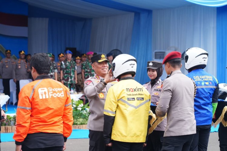 Lampung – Wakapolri Komjen Dedi Prasetyo memimpin Apel Ojek Online Keamanan dan Ketertiban Masyarakat (Ojol Kamtibmas) Polda Lampung di Bandar Lampung, Lampung. Mewakili Kapolri Jenderal Listyo Sigit Prabowo, Komjen Dedi menyampaikan harapan apel ini dapat menjadi simpul kolaborasi yang berkelanjutan semua pihak dalam menjaga kamtibmas di Lampung.